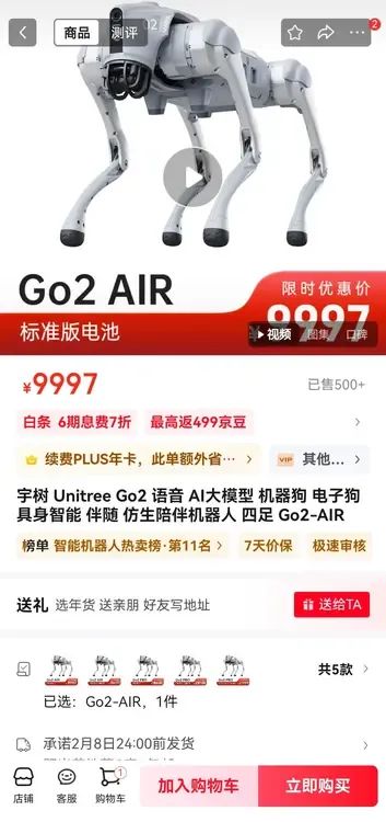 我當時覺得有點吃驚,因為印象中這個東西還是比較貴的,而且更多用於軍事領域,怎麼就隨便一個學生也能買來玩了,於是我在京東上搜了下,發現宇樹科技的Go2 air 只要9997元人民幣就可以包郵到家了,沒錯已經降到了1萬元人民幣。