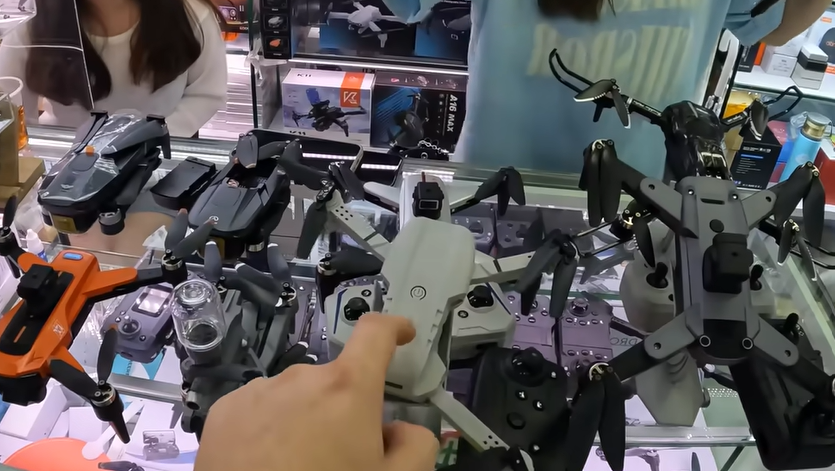 是我在2024年看到的兩個德國視頻博主在深圳華強北逛街,他們想買無人機,結果145元人民幣就買到了,下圖德國博主手指着的無人機,有兩個攝像頭。