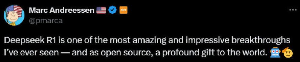 在網絡上流傳的這條推特説Deepseek R1是他見過最驚豔和最印象深刻的突破之一,同時作為開源模型,是給世界的一份厚禮。