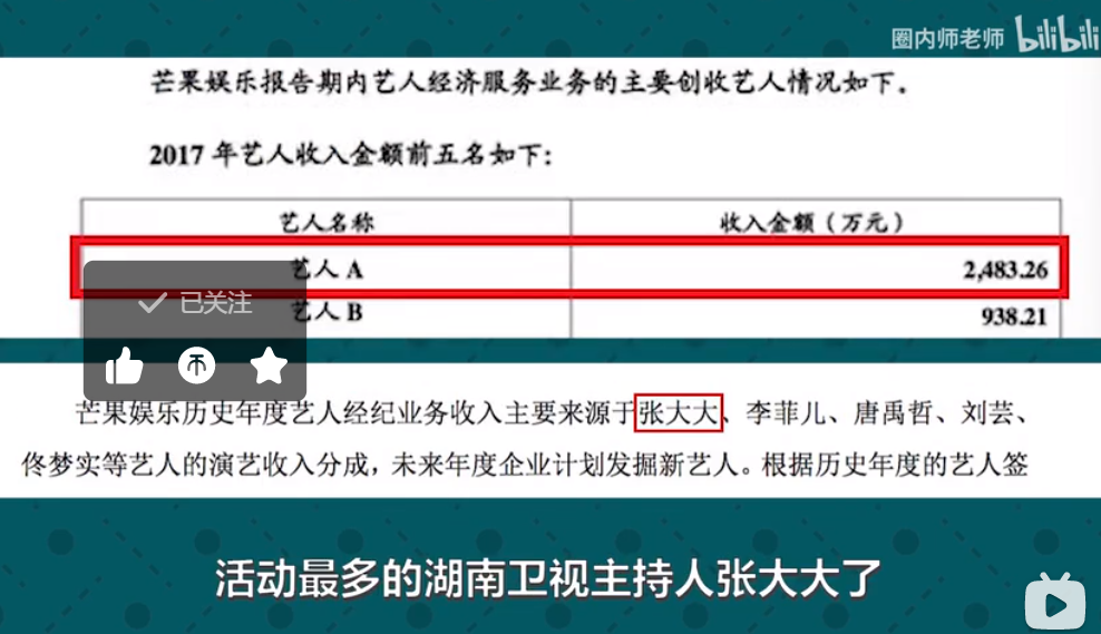 △ 截自b站《不要臉,為什麼能賺大錢?》,上圖藝人A為芒果經紀約中彼時咖位最大的張大大