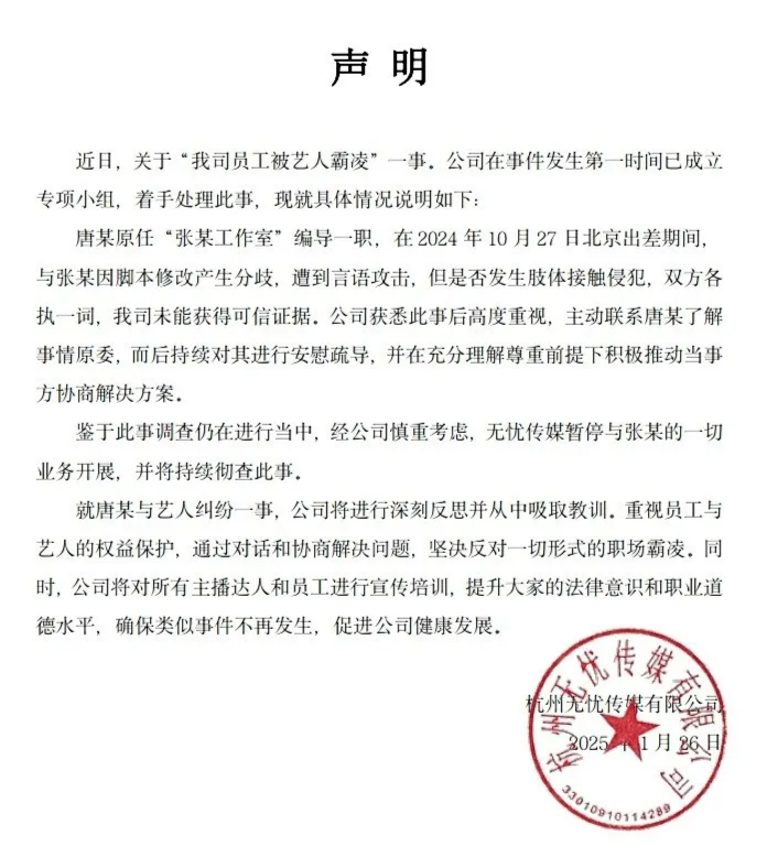 而隨着事件愈演愈烈,無憂傳媒也在1月26日發佈了公告,暫停和張大大的合作,做了切割。