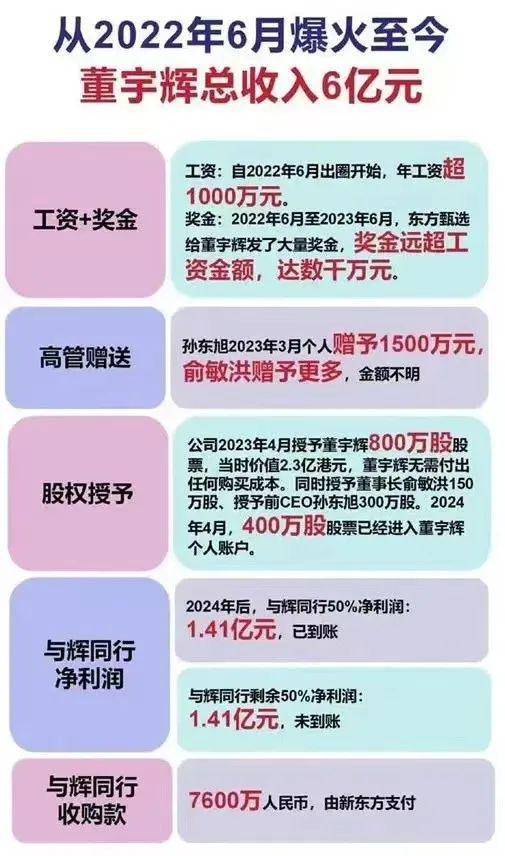 東方甄選當時宣佈,將旗下子公司與輝同行100%股權出售給董宇輝,作價為人民幣7658.5萬元。同時,此前的東方甄選股東溝通會上,俞敏洪表示:董宇輝此次離職,可以得到與輝同行淨利潤的50%,在分配之後,與輝同行賬面仍剩1.41億元。