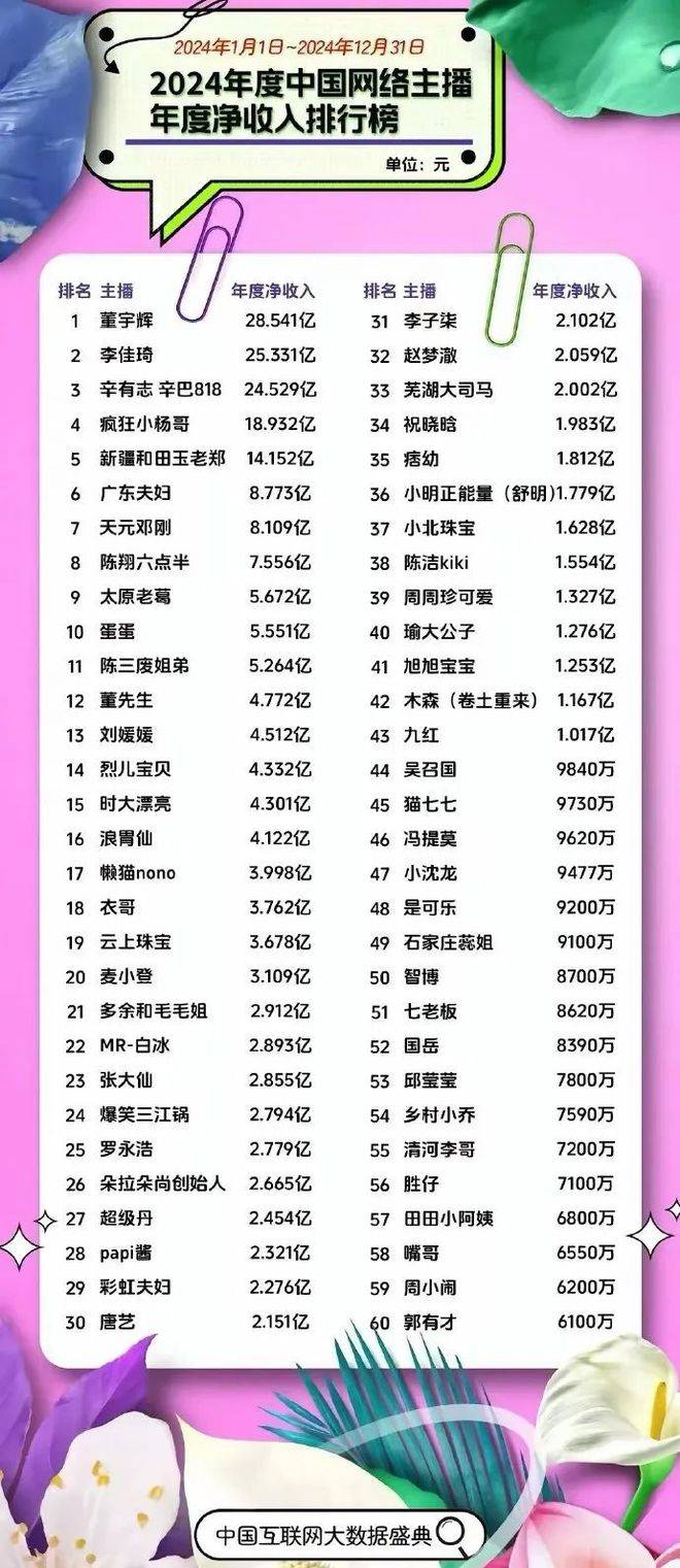 此外,根據中國互聯網大數據盛典公佈的“2024年度中國網絡主播淨收入排行榜”顯示,董宇輝以28.541億元淨收入位列榜單第一名,甚至“遙遙領先”瘋狂小楊哥近10億元。