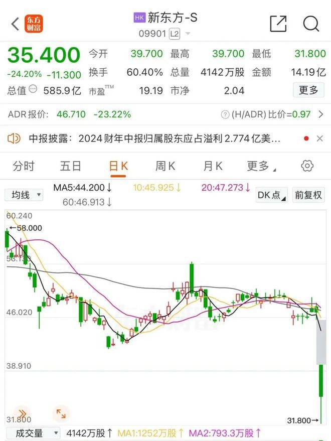 接着今天早上,港股新東方一度跌超30%,股價創2023年7月以來新低,截至收盤,仍大跌逾24.2%。