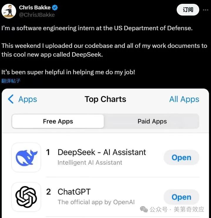 甚至連霸版第一的ChatGPT,在蘋果商店都被Deepseek反超,Deepseek在美國成為下載第一的app,攻守異勢。