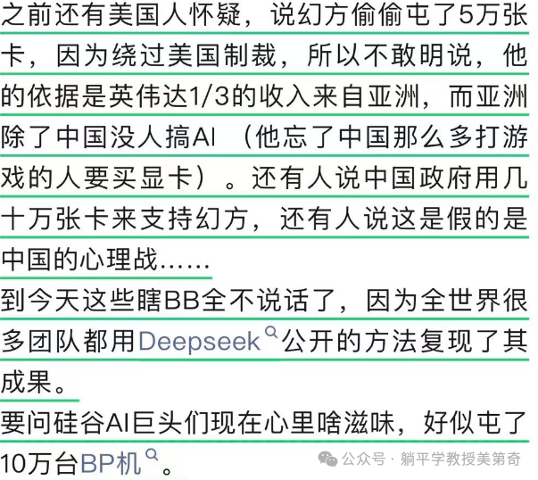 然後Deepseek一出,華爾街震動,硅谷黑天鵝,用腳投票的資本不會説謊,洋人都覺得彎道超車趕上來了,咱們的學閥還在重複:中國不行的,你們不學美國怎麼能行呢?