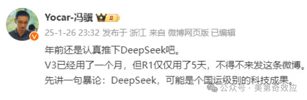 昨天因為《黑神話悟空》把整個歐美遊戲界摁在地上摩擦的馮驥,發了一條微博,説國產大模型Deepseek R1,是真的國運級別的突破。