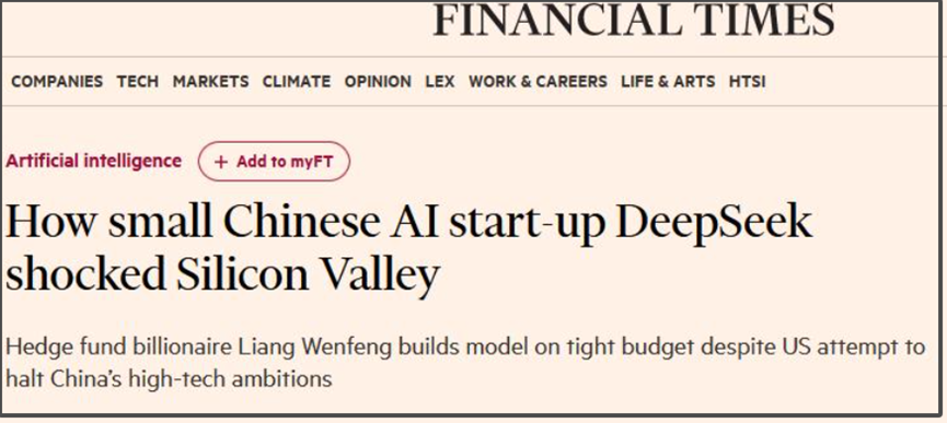 不單單紐約時報,包括英國金融時報等西方主流媒體,都在1月24日大量報道DeepSeek。