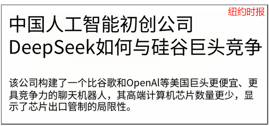 紐約時報的標題是《中國人工智能初創公司DeepSeek如何與硅谷巨頭競爭》。