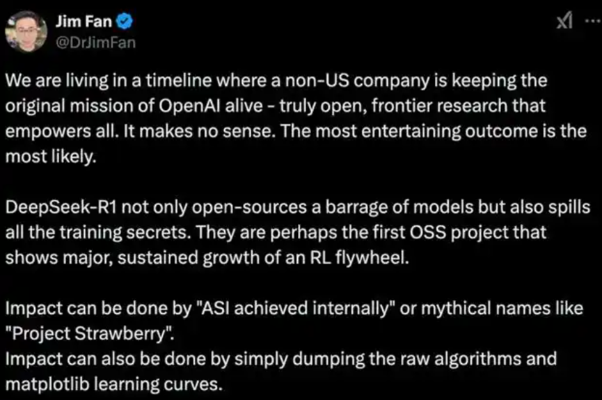 英偉達高級研究科學家Jim Fan評價道:“我們正生活在一個特殊的時代:一家非美國公司在真正踐行着 OpenAI 最初的使命——開展真正開放的前沿研究,為所有人賦能。這看似不合常理,但最富戲劇性的往往最可能發生。DeepSeek-R1 不僅開源了大量模型,還公開了所有訓練細節。”