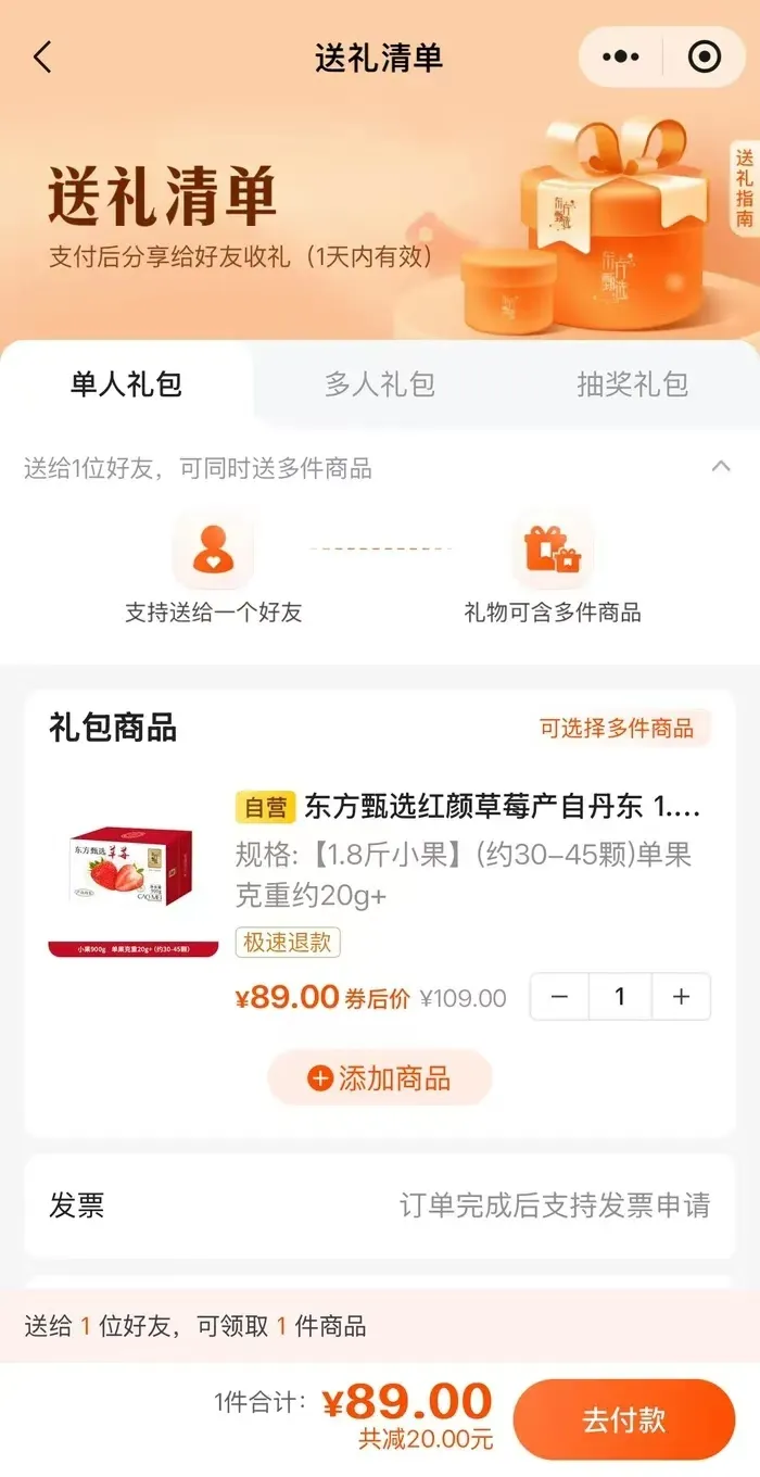 除了自營,東方甄選也在積極嘗試不同的銷售渠道和模式。近期,隨着微信上線送禮功能,東方甄選也成為第一批吃螃蟹的商家。