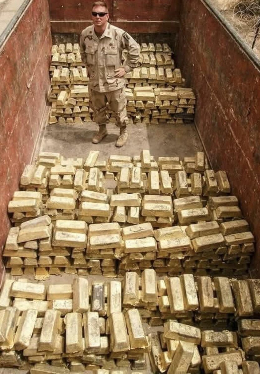 這張照片拍攝的是一名美國士兵,他站在一輛滿載黃金的卡車旁,這些黃金是從薩達姆·侯賽因手中沒收的。照片拍攝於2003年伊拉克戰爭初期。