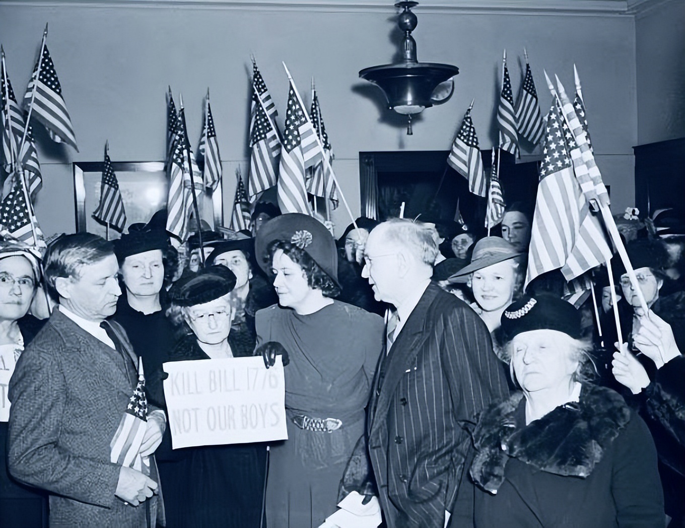 接下來回到美國。這張照片顯示了美國母親聯盟的成員,她們在1941年2月抗議租借法案。在標語上寫着:“廢除1776號法案,而不是我們的孩子。”