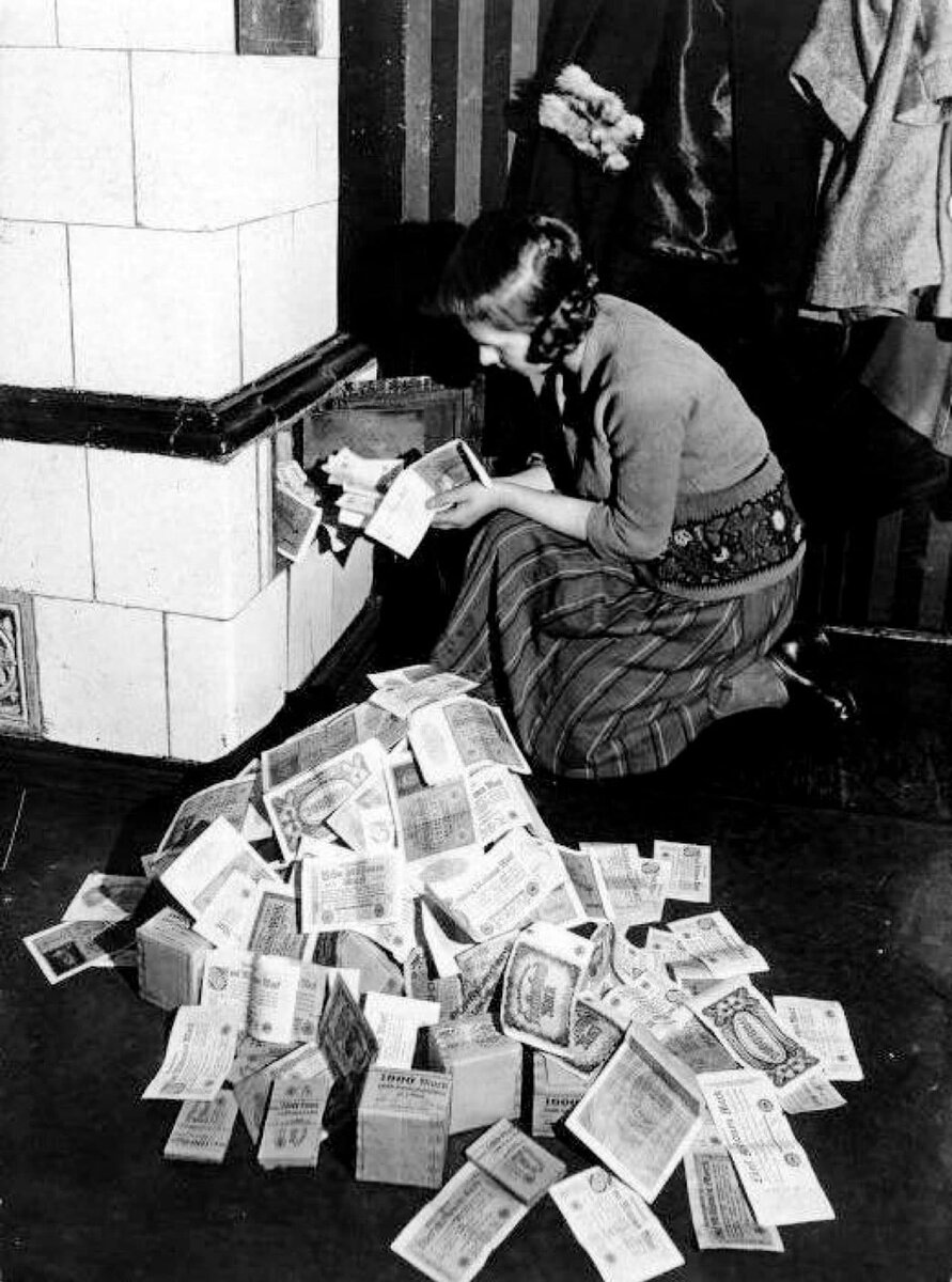 第一次世界大戰結束後,德國作為戰敗國需要向勝利國支付賠款。然而,到1923年,德國的超高通貨膨脹率導致1美元兑換4.2萬億馬克!德國馬克已經沒有太大價值了,用它只能當燃料燒火。因此,煤炭比馬克更有價值,而且煤炭還能提供更多熱量。