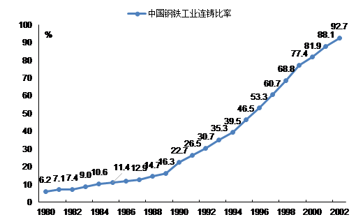 2002年,中國鋼鐵工業的連鑄比率首次超過90%,追趕上了以日本、德國為代表的西方國家的水平,這距離1991年寶鋼二期項目全面建成僅過了十一年時間。