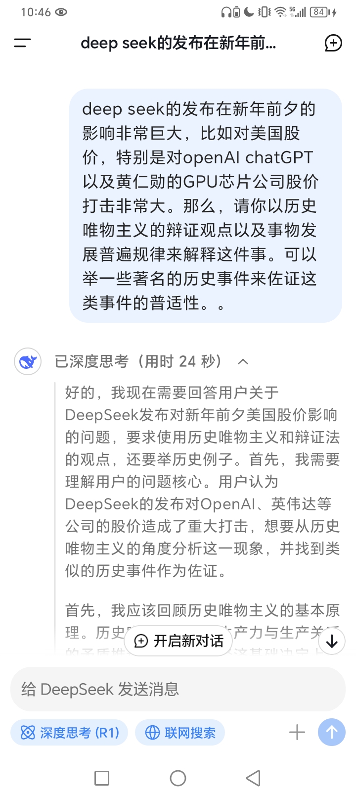 歷史反覆證明,**技術革新引發的短期市場震盪,本質是生產力進步倒逼生產關係調整的必經階段**。DeepSeek對股價的衝擊並非孤立事件,而是技術-資本-市場矛盾運動的常態表現。從辯證視角看,這種衝擊既是舊秩序的“危”,也是新秩序的“機”,最終將推動AI產業向更高效、更普惠的方向發展。正如馬克思所言:“一切堅固的東西都煙消雲散了”,但消散的背後是新世界的誕生。