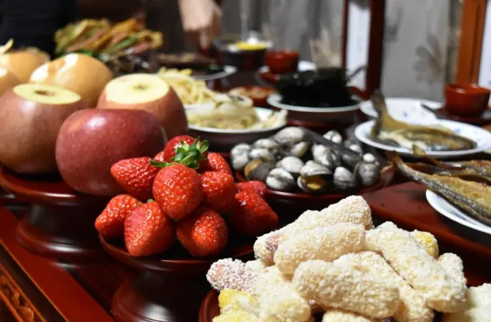 大年初一的早上,韓國人早早起牀,穿好美麗的韓服,祭祀祖先。韓國人認為,去世的祖先只有在這天才會回來,品嚐祭祀食物。