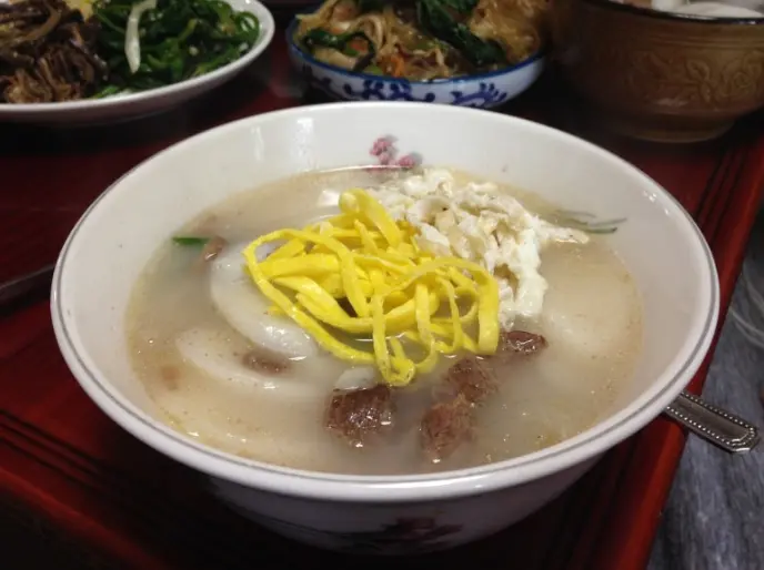 中國過年的時候吃餃子,而韓國則是吃年糕湯。祭祖、拜年結束後,祭祖所用的“年糕湯”便成為韓國人初一早上必吃的傳統食物,稱之為“歲饌”。而吃年糕就意味着長了一歲,故也稱為“添歲餅”。長條的年糕寓意着健康長壽,而銅錢一樣圓圓的年糕則寓意着財富。