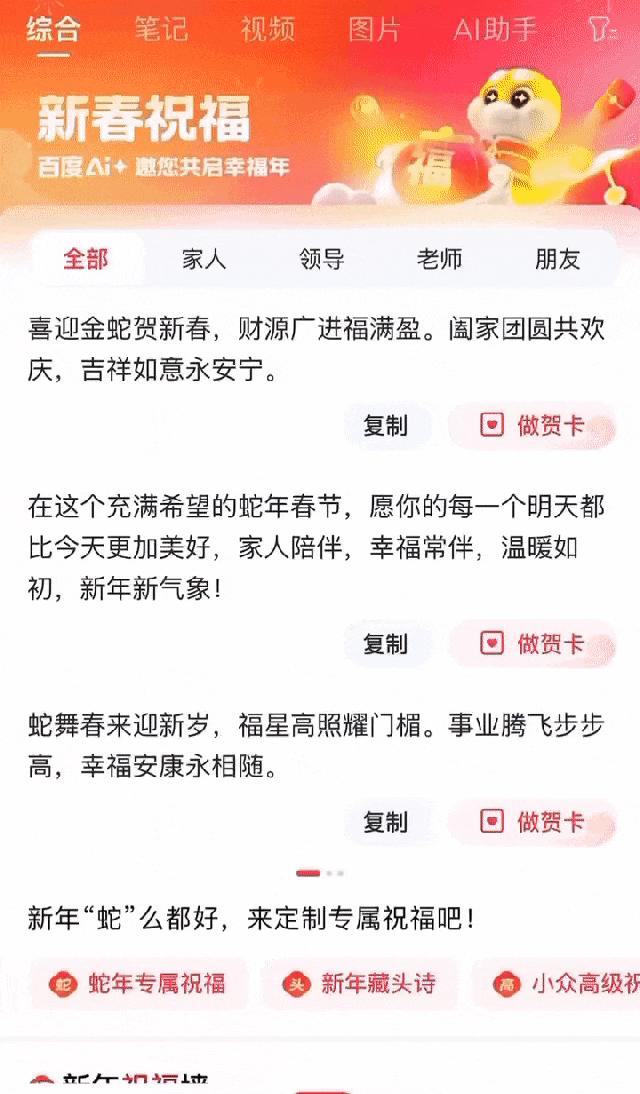 比如雯雯在百度搜索“AI拜年”,找到了一個定製照片賀卡功能。
