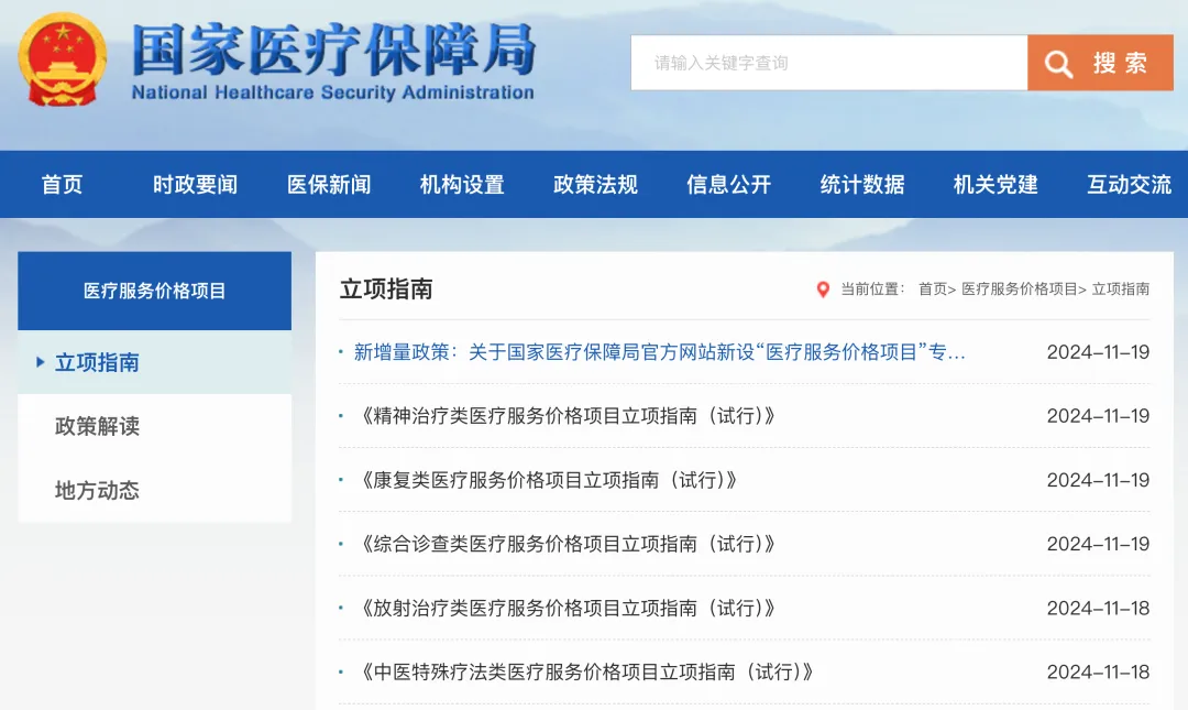 11月8日,國家醫保局官網新設“醫療服務價格項目”專欄,密集發佈醫療服務價格項目立項指南,目前包括護理、綜合診查、康復、產科、輔助生殖、口腔種植、放射治療、器官移植等17批立項指南。