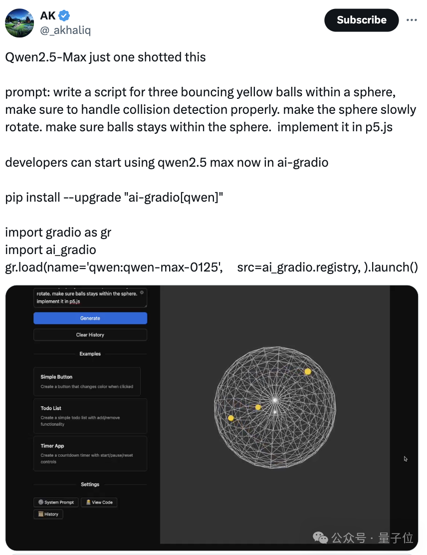 代碼能力上,Qwen2.5-Max能夠幫助用户完成各種可視化創作,一句話就能做出下面這樣旋轉的球體: