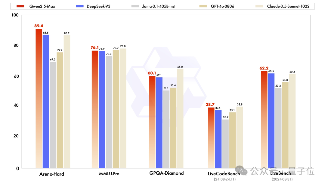 Arena-Hard、LiveBench、LiveCodeBench、GPQA-Diamond等基準統統拿下,Qwen2.5-Max整體表現優於DeepSeek V3、Llama-3.1-405B以及閉源模型GPT-4o,和Claude-3.5-Sonnet也能比一比。