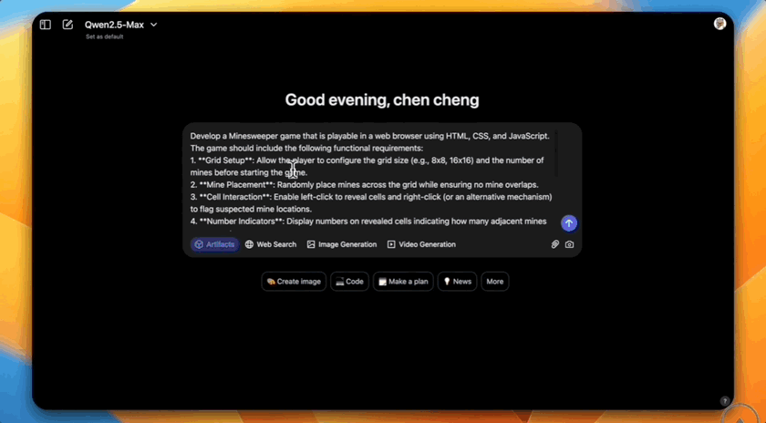 Qwen2.5-Max也有Artifacts功能,同樣一句話,能開發各種小應用、小遊戲。
