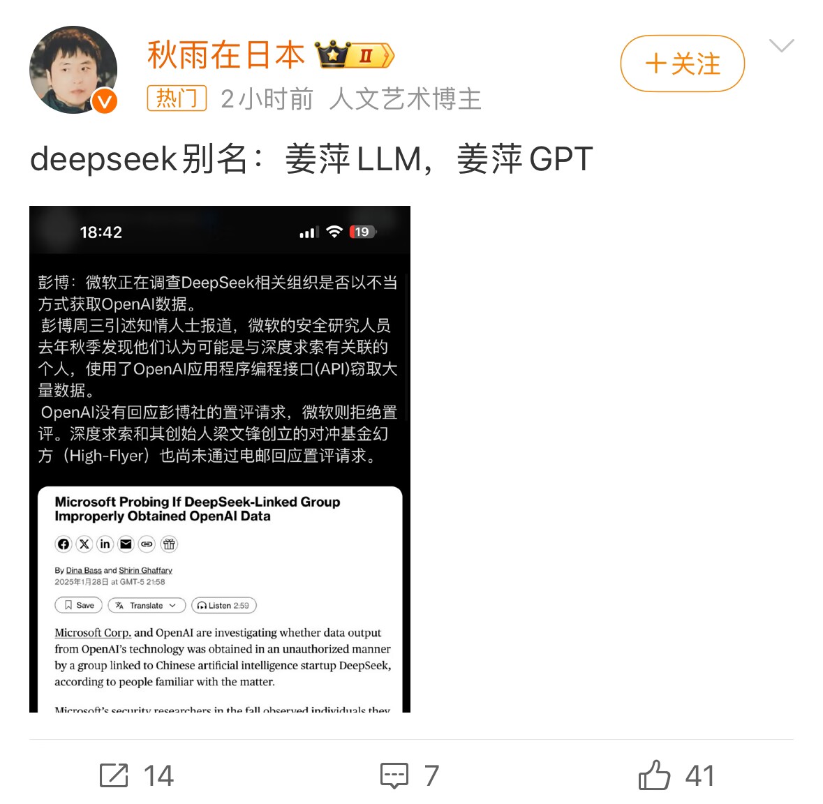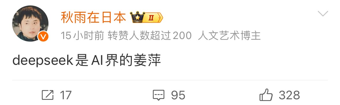 抄襲説,套殼説這種都已經是常規了,不算啥。有一種實在是讓我感到新奇:deepseek是第二個“姜萍”。