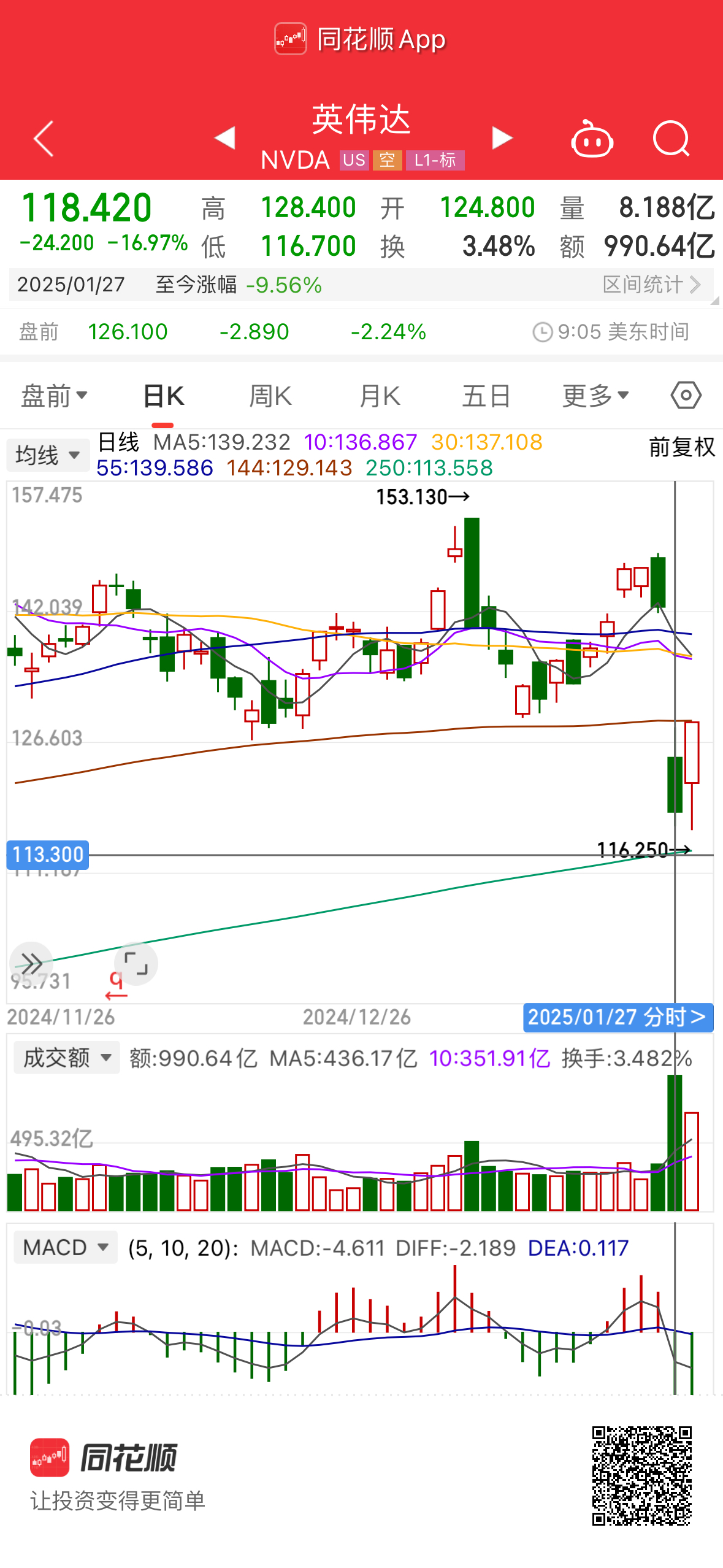 如果當時姜萍做到了這些還會有質疑麼?而DEEPSEEK就做到這些了,不僅僅所有人可用可復現,而且還引起了資本的恐慌。在DS R1公佈之後,英偉達從148美元一路被幹到120美元。雖然第二天立即反彈到128,但從今天盤前價來看又得繼續往下跌。