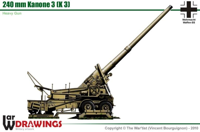 1935年,德國萊茵金屬(Rheinmetall)公司開始研發一種高威力的240毫米重炮,該火炮後來被德國國防軍(Wehrmacht)列裝,並正式命名為 24 cm Kanone 3(K3)。這門火炮成為德國最具特色的遠程火炮之一,專門用作高度機動化的遠程打擊武器,能夠對敵軍縱深的戰略目標進行遠距離精確打擊。