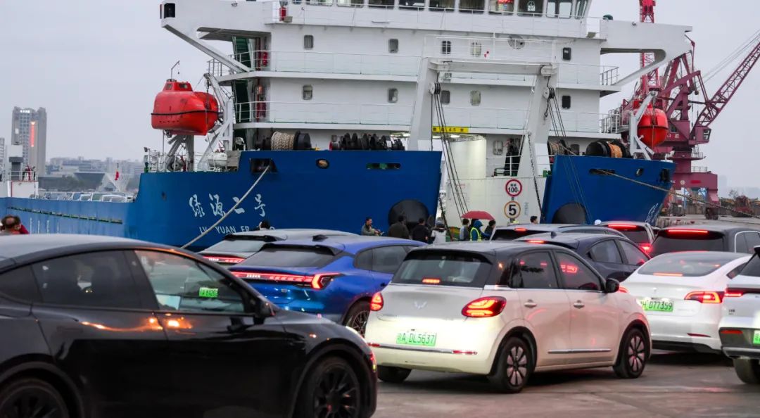▲1月26日,在海南省海口市秀英港,新能源車輛排隊駛入新能源車專用運輸船“綠源二號”。(新華社)