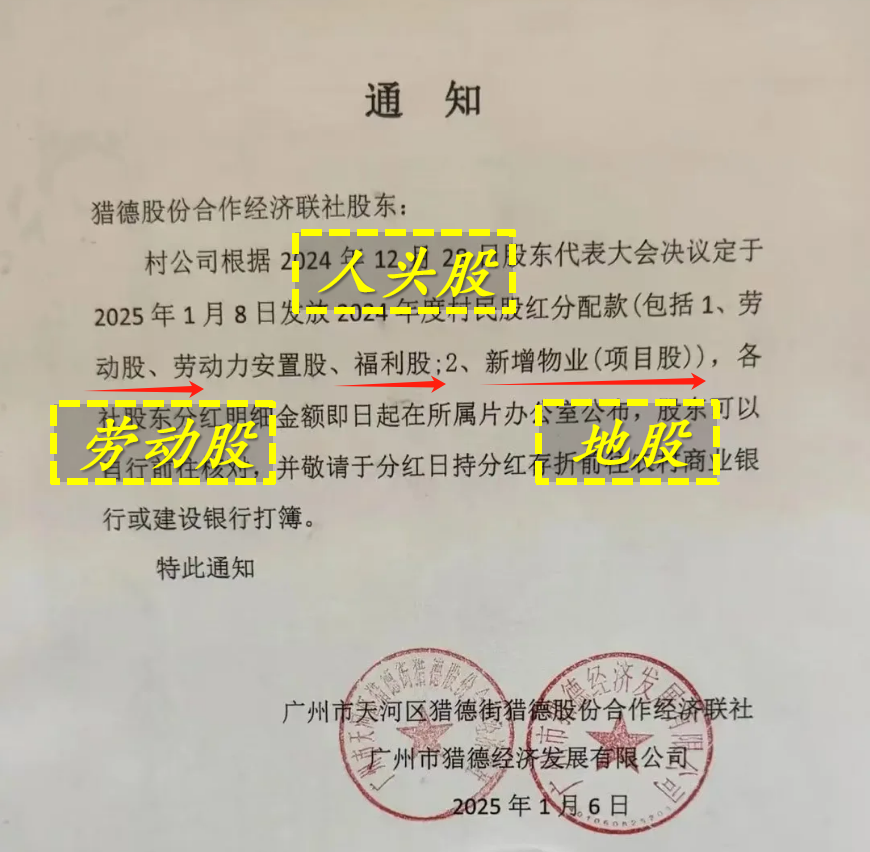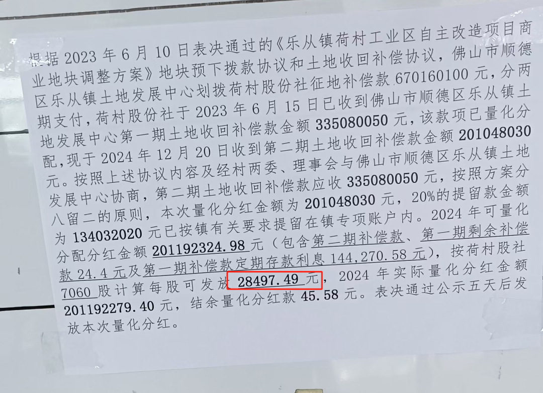 包括佛山樂從鎮的荷村,2024年分紅就包含了土地收回補償款