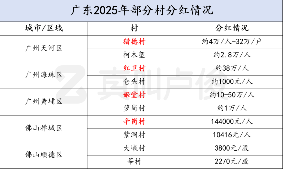 哪怕像廣州知識城的蓮塘、湯村,佛山的大墩村、莘村等,人均分紅也有2千-1萬元不等