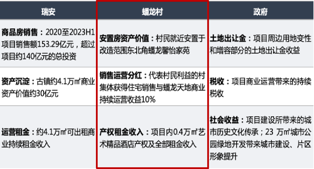 除了村民各自的安置房,改造後的銷售分紅、物業租金收入也是全體村民共享的