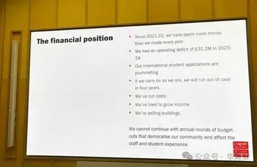 《衞報》稱,記者看到的一份會議幻燈片顯示,該大學在2023-24年度的運營赤字為3120萬英鎊,其國際學生申請量“驟降”,如果繼續按當前模式運作,四年後將“耗盡資金”。