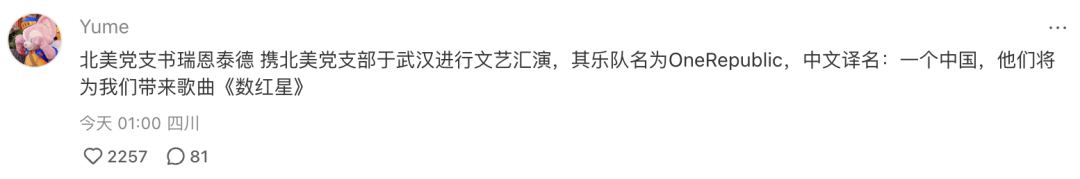 OneRepublic翻譯過來叫“共和時代”,上春晚就是“共和時代,上共和國的春晚”,這不正是咱一直追求的“天下大同”嘛。
