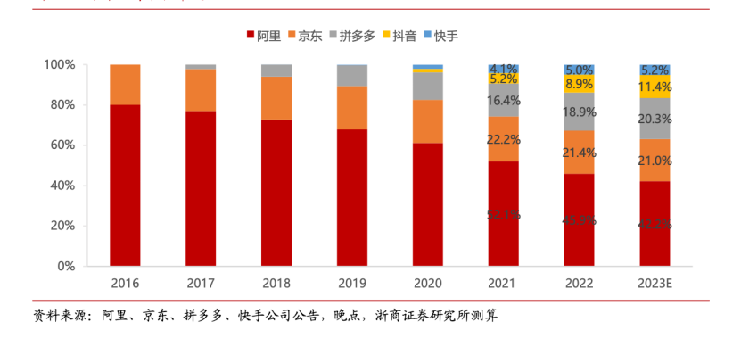 浙商證券2023年發佈的一份研報提及,預測2023年電商行業頭部的阿里、京東、拼多多、抖音、快手的市佔率分別為 42.2%/21.0%/20.3%/11.4%/5.2%。蔣凡在2022年4月離開國內電商業務,2021年,阿里的市佔率是52.1%。