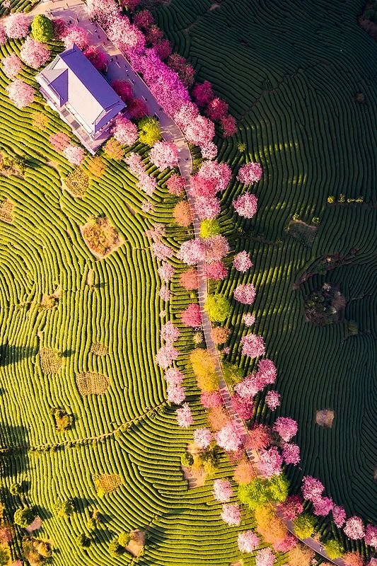 當別地的春天還在慢慢啓動的時候,這裏已經茶香櫻舞。漫山的櫻花如緋紅的雲霞,在翠綠的千畝茶園中温柔盪漾開來。