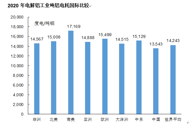 根據IAI的數據,2020年中國生產電解鋁的耗電量是13543千瓦時/噸,顯著低於北美15008千瓦時/噸和歐洲15499千瓦時/噸的水平。