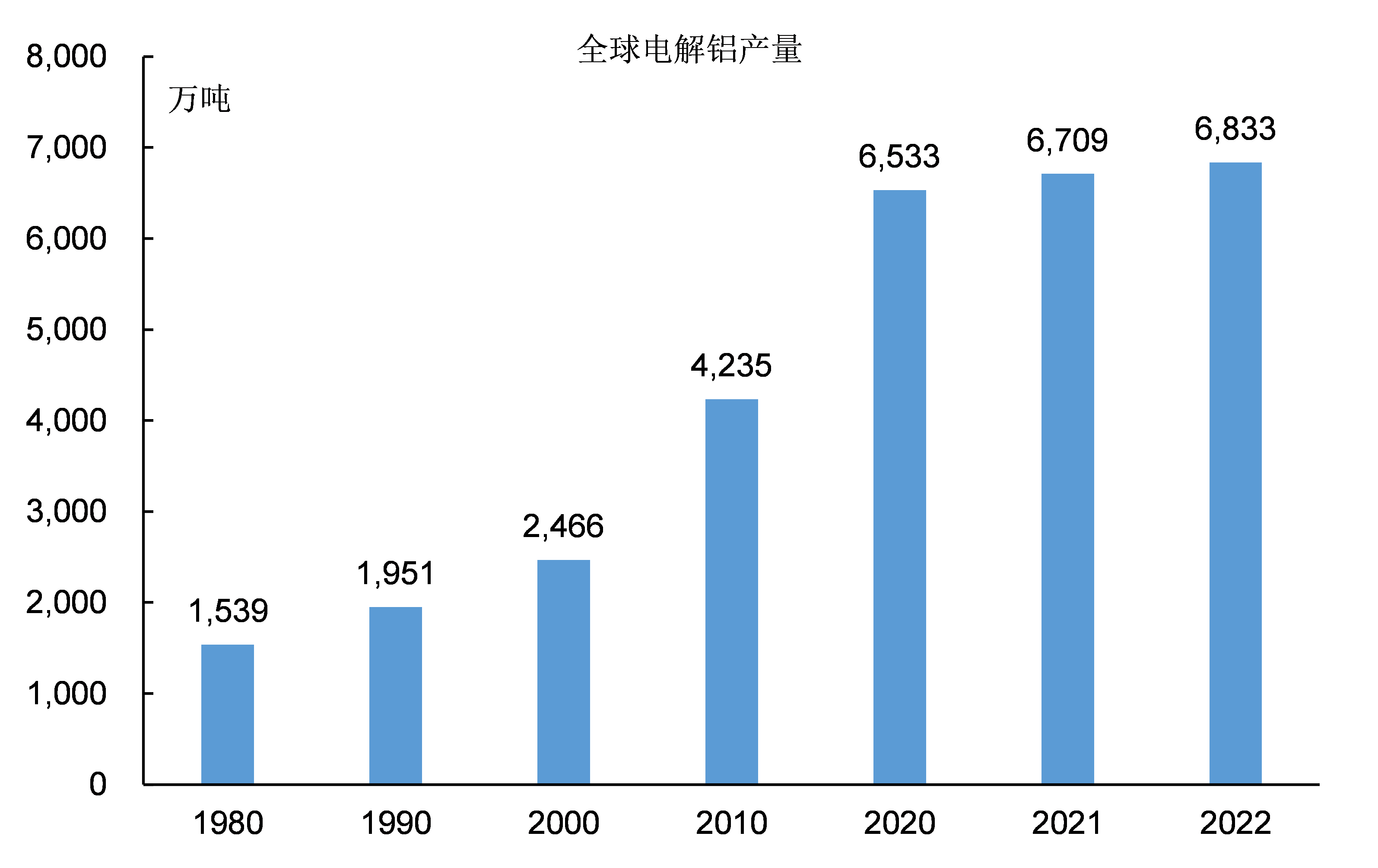 2022 年,全球電解鋁產量進一步增長至 6833 萬噸。