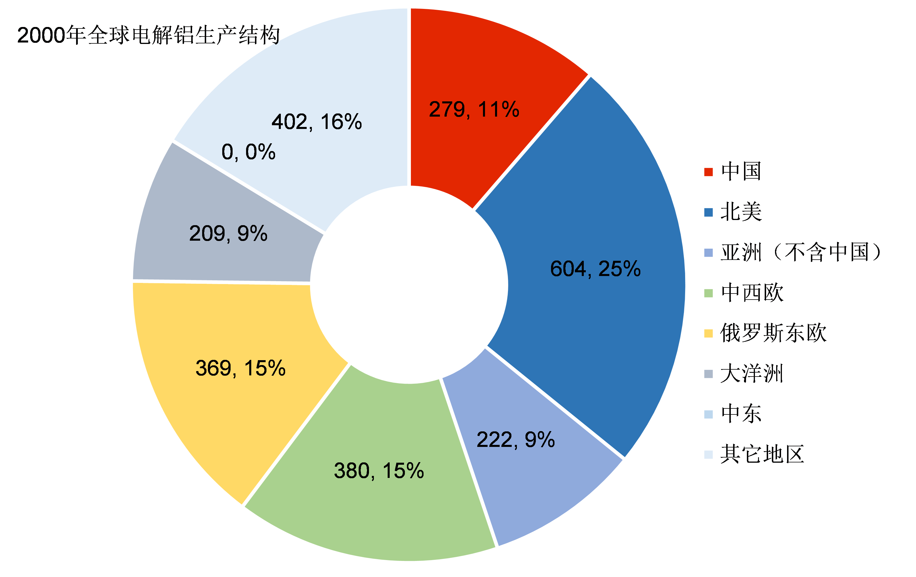 2000年中國電解鋁產量是 279 萬噸,低於北美、中西歐以及俄羅斯東歐,僅佔世界總量的11.3%。