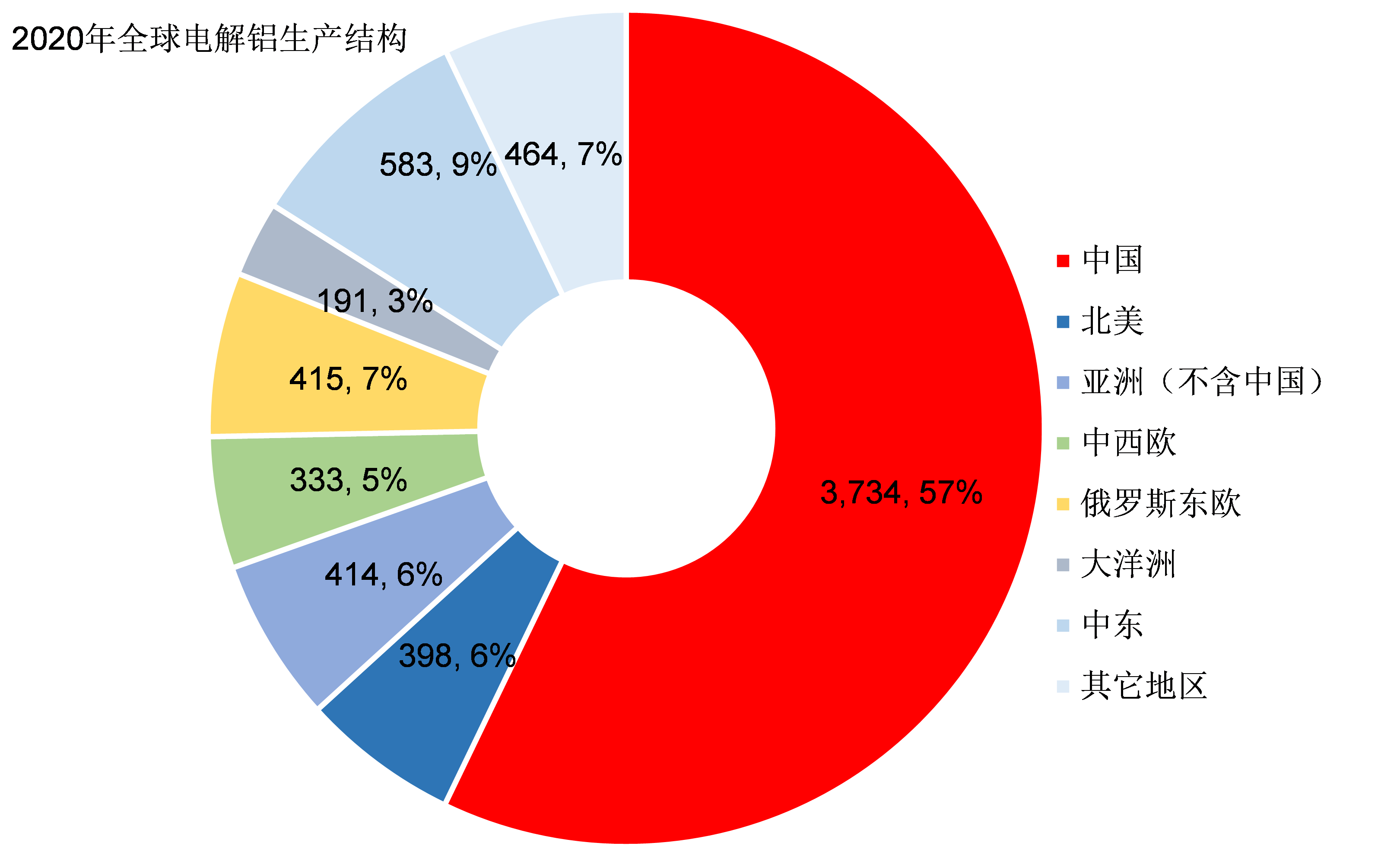 2020年,北美的電解鋁產量減少至398萬噸,僅佔世界總量的 6%;同期西歐和中歐的電解鋁產量減少至333萬噸,佔全球總產量的比例僅有5%。
