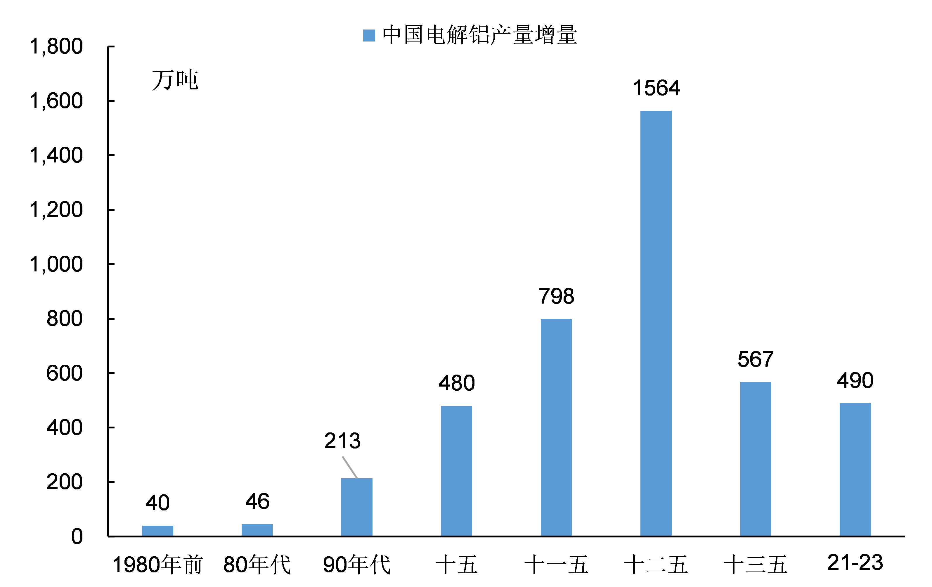從八十年代開始中國電解鋁產量的增長速度開始顯著加快,80年代十年產量增加了46萬噸,90年代十年產量增加了213萬噸。