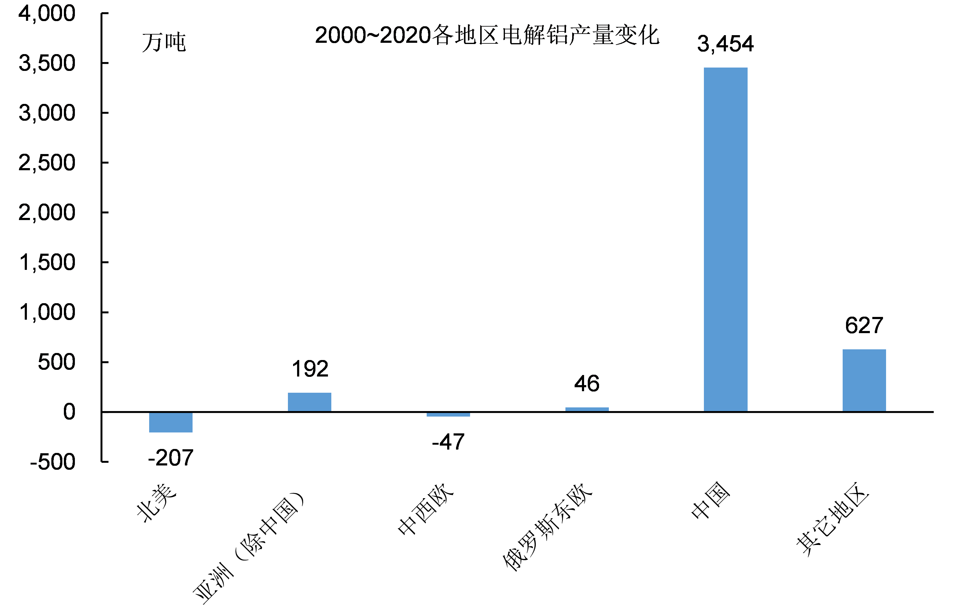 從2000年到2020年,全球電解鋁產量增加了4067萬噸,其中中國電解鋁產量增加了3454萬噸,在全球增量的84.9%。