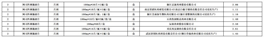 採購額最大的阿司匹林腸溶片,京新藥業報出0.034元/片的最低價格,最高價也不過0.048元/片。這是一個年銷售額超30億元的大品種。2023年,原研藥企拜耳仍佔據80%以上的市場規模,國採前,其價格在0.5元/片左右。此次國採,拜耳似乎未參與價格申請。