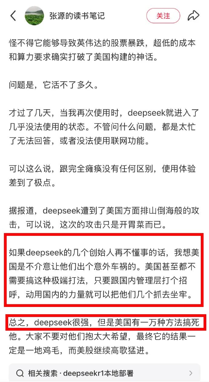 而最為荒誕卻又狂妄的,是國內居然有人公然對DeepSeek 的創始人發出死亡威脅,揚言如果“再不懂事的話”,“我想美國是不介意讓他們出個意外車禍的。美國甚至都不需要搞這種極端打法,只要跟國內管理層打個招呼,動用國內的力量就可以把他們幾個抓去坐牢。”
