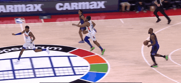 濃眉在場,不只是每場能給湖人穩穩的25分,還能懲罰對方的擴防。濃眉下場,湖人只能提速,費城大肆擴防切割湖人的守轉攻。第二節克里斯蒂,第三節勒布朗,都有過守轉攻試圖提速,被費城切掉,就地打反擊。
