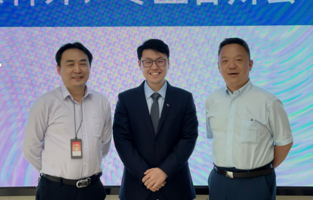 何世豪與他的碩士導師王嶸教授(左一)、博士導師趙元立(右一)