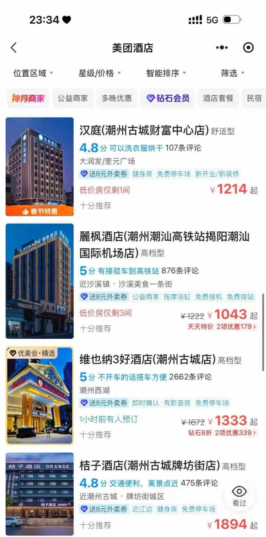 原本去潮汕揭陽看煙花、燒火龍的姿姿就是因為酒店太貴取消了旅行。她在美團平台預定酒店的時候,發現就連桔子連鎖酒店都漲到了1894元一晚。