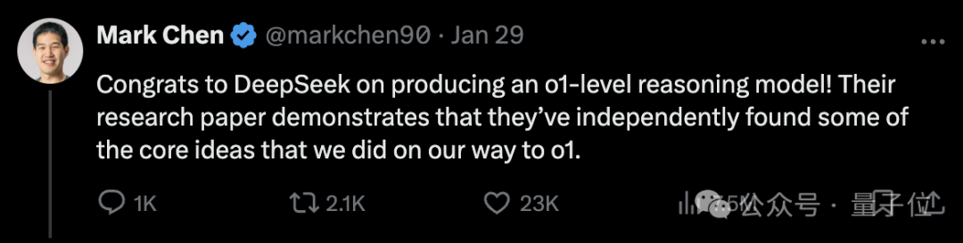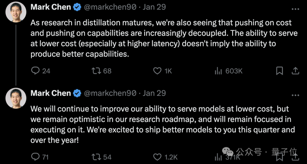 而且關鍵是,DeepSeek R1並非只是簡單蒸餾模型,OpenAI首席科學家Mark Chen表示: